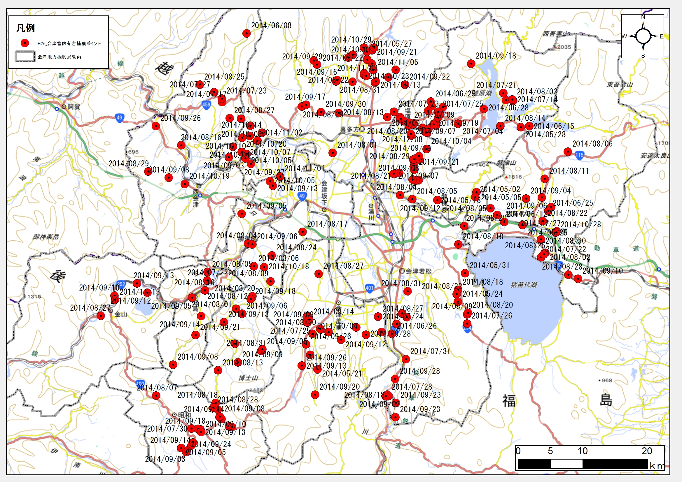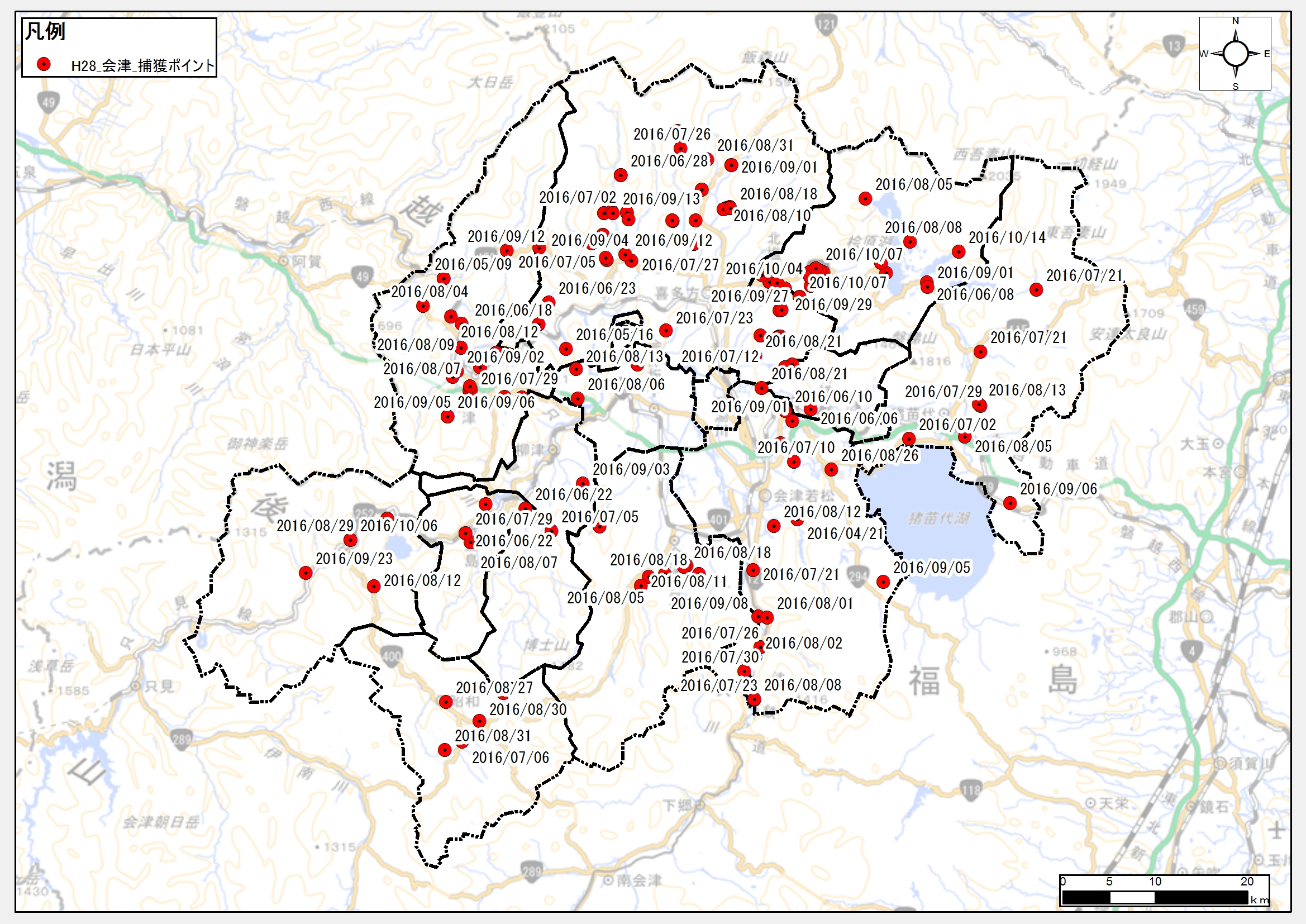 会津管内のツキノワグマの有害鳥獣捕獲位置図