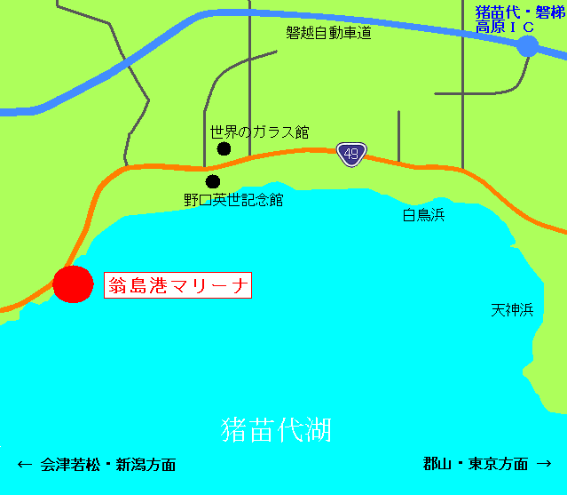 野口英世のふる里、猪苗代町。宝の山磐梯山を背景に、日本一の水質を誇る猪苗代湖に翁島港マリーナはあります。 収容可能艇数は101隻、ディンギーヨット・水上オートバイ保管可能艇数が計151隻。 平成15年に完成したクラブハウスは、木材をふんだんに使用したログハウス調で、ゆったりくつろぐことができます。 また、内水面ですので波は穏やかで、大部分で携帯電話が通話可能ですので、安心してマリンライフをお楽しみ いただけます。