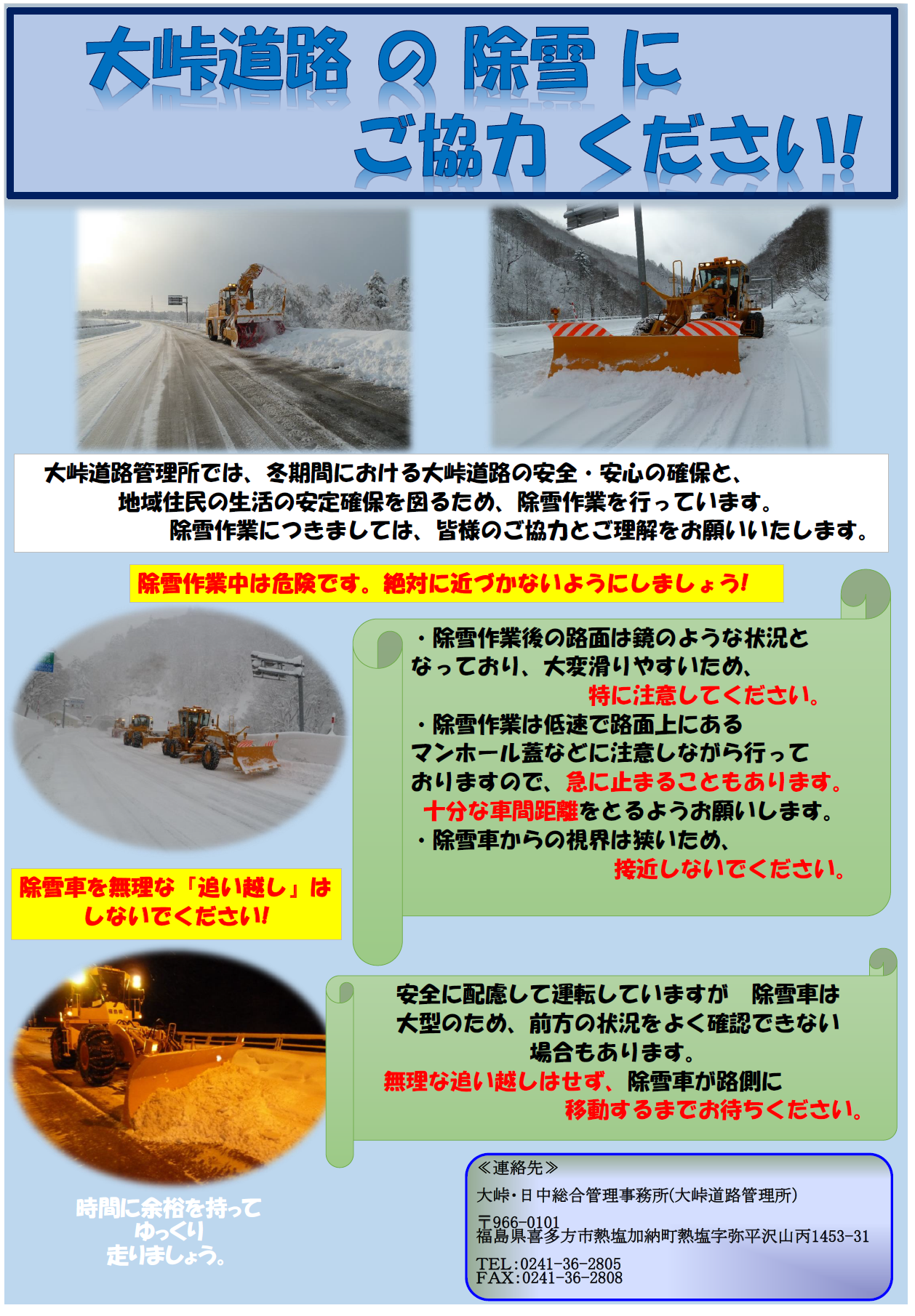 飯豊連峰のふもとを通過する大峠道路は、本格的な冬期間の12月から翌年の3月末まで、 24時間体制で道路除雪に臨んでいます。