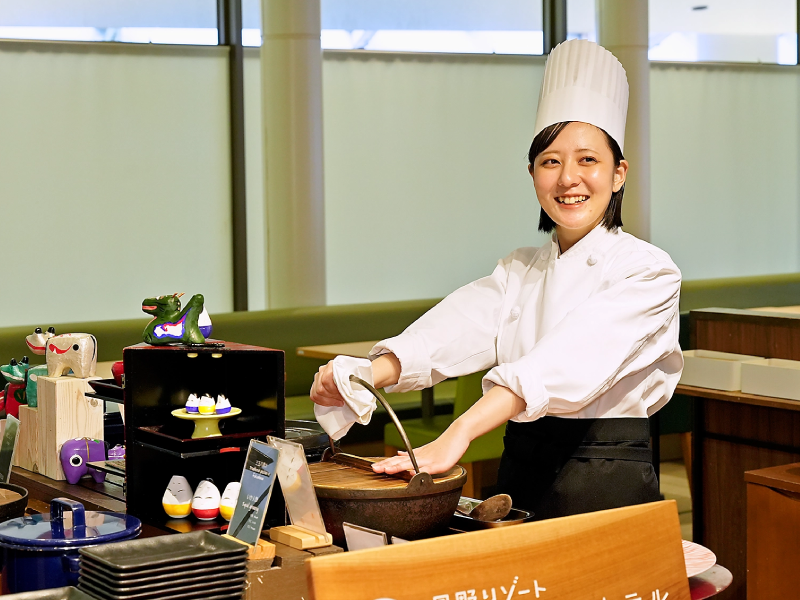 接客や調理、清掃などが主な業務です。また、社員同士での意見交換を積極的に行い、新しいサービスの提案ができるのが星野リゾートの特徴です。冬はスキー場の運営業務もあり、チケットの管理やスキーレッスンも行っています。